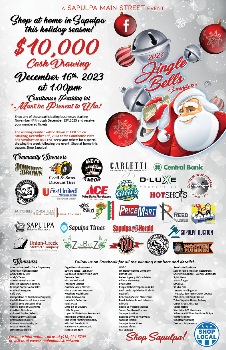 Jingle Bell Sweepstakes is one of Sapulpa's favorite holiday events. You have the chance to win $10,000 just by shopping your favorite home town stores! Make a purchase in any of our participating stores in Sapulpa, receive your tickets and join us downtown to see if you win! Tickets are given out at over 100 participating stores in Sapulpa beginning the first weekend in November through the night before the drawing! Then join us downtown at the Courthouse Plaza parking lot at 1:00pm to see if you have the winning ticket! Shop at home this holiday season, shop Downtown Sapulpa!